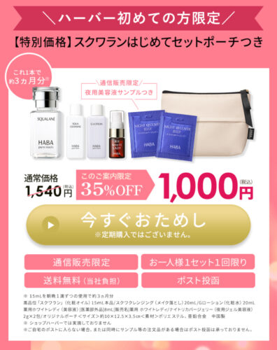 人気美白美容液に加えて、ハーバーのロングセラーオイル「高品位 スクワラン」が約3ヶ月分入っているお得な内容です。